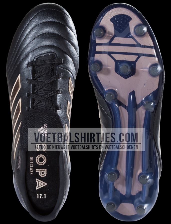 Op de foto’s zie je de duurdere 17.1 uitvoering maar Adidas zal ook met een 17.2 en 17.3 serie op de markt komen. Deze voetbalschoenen hebben een donkerblauw Sprintframe als basis en een bovenkant van leer. Op de zijkanten van de schoen zie je drie koperkleurige Adidas strepen. Deze koperkleur is ook gebruikt voor het Adidas logo op de hak van de schoen. Onder dit logo is het cijfer 17 in het materiaal verwerkt. De naam Copa staat op de binnenkant van de voet. De onderkant is voorzien van elf transparante noppen. Ook hier zie je de koperkleur weer terug. Op de zwarte inlegzool staat de naam Copa, het serienummer 17.1 en daaronder de tekst Outclass. Je koopt de nieuwste Adidas voetbalschoenen 2017 na lancering hier online.