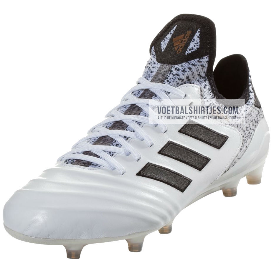 Naast de kleuren white en Black komen ook de kleur Tactile Gold Metallic hierin terug. Op de eerste foto zie je de duurste 18.1 versie uit de serie. Deze is voorzien van een wit frame met opstaande rand rond de enkels. Het bovenste gedeelte van de schoen is van leer en heeft vier golvende randen bovenop de voet. De buitenkant van de voet is voorzien van drie zwarte Adidas strepen. De witte stof rond de enkel en onder de veters is voorzien van zwarte vlekken. Op de lip staat een Adidas logo in de Gold Metallic kleur. Deze kleur zie je ook terug in de transparante noppen.