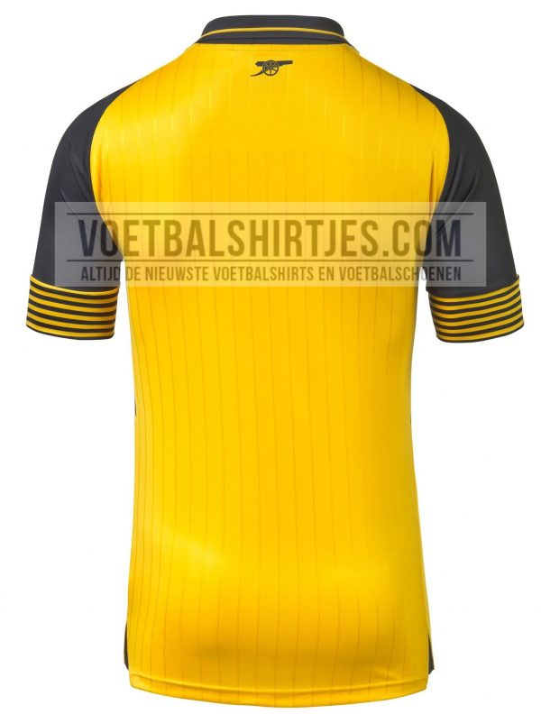 Daar waar het nieuwe Arsenal thuisshirt al begin mei bekend gemaakt zal worden, zal dit nieuwe Arsenal uitshirt pas beschikbaar zijn vanaf juli 2017. Deze nieuwe voetbalshirts 2017 kun je na lancering hier online bestellen. Dit nieuwe uitshirt is aan de bovenkant afgewerkt met een grijs/zwarte (volgens Puma zwart) v-hals met polokraag. Deze kraag is voorzien van een dun streepje in de kleur gele kleur. De mouwen van dit Arsenal shirt 2017 zijn aan de bovenkant geel en aan de onderkant zwart/grijs. De mouwen zijn onderaan afgewerkt met een horizontaal gestreept patroon in dezelfde kleuren. Op de linkerborst is het bekende klassieke Arsenal logo te zien. Op de andere kant het Puma logo. De logo van deze fabrikant zien we ook terug op de bovenkant van de armen. Verder is de voorkant van dit Arsenal tenue voorzien van dunne verticale strepen die in de stof zijn verwerkt.