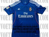 Wereldprimeur !! Dit zijn de eerste officiele foto’s van het nieuwe Real Madrid uitshirt 2013/2014. Dit nieuwe Real Madrid uitshirt is donkerblauw, heeft een ronde hals en witte details als de Adidas strepen over de schouders en de namm van shirtsponsor Fly Emirates. In de zijkant van het het shirt zit een dun oranje randje. De achterkant is volledig blauw. Zoals je op de onderste foto kunt zien staat in de rand van de kraag de naam Real Madrid verwerkt. Dit nieuwe Real Madrid uitshirt 2014 is na lancering hier te [Lees meer...]