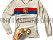 Voetbalclub Genoa uit Italië heeft ter ere van het 100-jarig bestaan een nieuw retro uitshirt 2013/2014 op de markt gebracht. Dit speciale voetbalshirt is gebaseerd op het oude uitshirt dat de club in 1913 droeg tegen AC Milan en is van het merk Lotto. Dit nieuwe retroshirt is wit en heeft een v-hlas met een polokraagje. Over de borst gaat een brede baan in de kleuren rood en blauw. In het midden hiervan staat het Genoa logo. Linksonder staat de datum 22-02-1913 met daaronder 22-02-2013. Dit speciale voetbalshirt is zeer beperkt verkrijgbaar. Er zullen slechts 500 stuks op de markt komen. De nieuwste voetbalshirts zijn altijd als eerste hier te [Lees meer...]